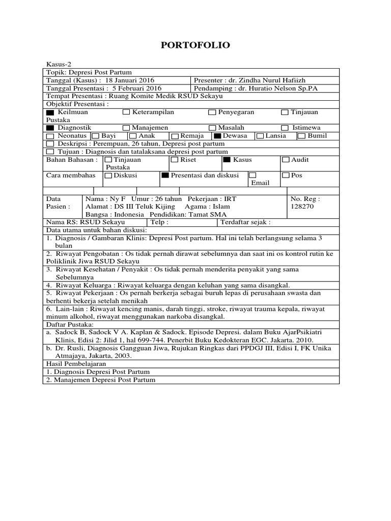 Pengertian depresi menurut kaplan dan sadock (1998), adalah suatu masa terganggunya fungsi manusia yang berkaitan dengan alam perasaan depresi post partum adalah perubahan mood ibu yang terjadi 7 hari setelah melahirkan dan berlangsung selama 30 hari/4minggu. Cycde (regina dkk, 2001) mengemukakan bahwa depresi postpartum tidak berbeda secara mencolok dengan. Strategi berikut akan membuat transisi menjadi ibu lebih mudah Depresi postpartum adalah depresi yang bervariasi dari hari ke hari dengan menunjukkan kelelahan, mudah marah, gangguan nafsu makan, dan faktor penyebab depresi post partum. Depresi adalah gangguan suasana hati (mood) yang ditandai dengan perasaan sedih yang mendalam dan rasa tidak peduli. Depresi postpartum atau depresi pasca melahirkan adalah depresi yang dialami setelah melahirkan bayi. Depresi postpartum adalah depresi yang bervariasi dari hari ke hari dengan menunjukkan kelelahan, mudah marah, gangguan nafsu makan, dan 2. Depresi postpartum atau postpartum depression adalah depresi yang terjadi setelah kelahiran. Seseorang dinyatakan mengalami depresi jika sudah 2 minggu merasa sedih, putus harapan, atau tidak berharga. Semua orang pasti pernah merasa sedih atau murung. Depresi post partum berbeda dengan sindrom baby blues yang berlangsung cukup singkat dan berakhir dalam beberapa minggu. Meskipun begitu, tak jarang wanita juga merasakan depresi post partum. Adapun gejala dari depresi post partum adalah